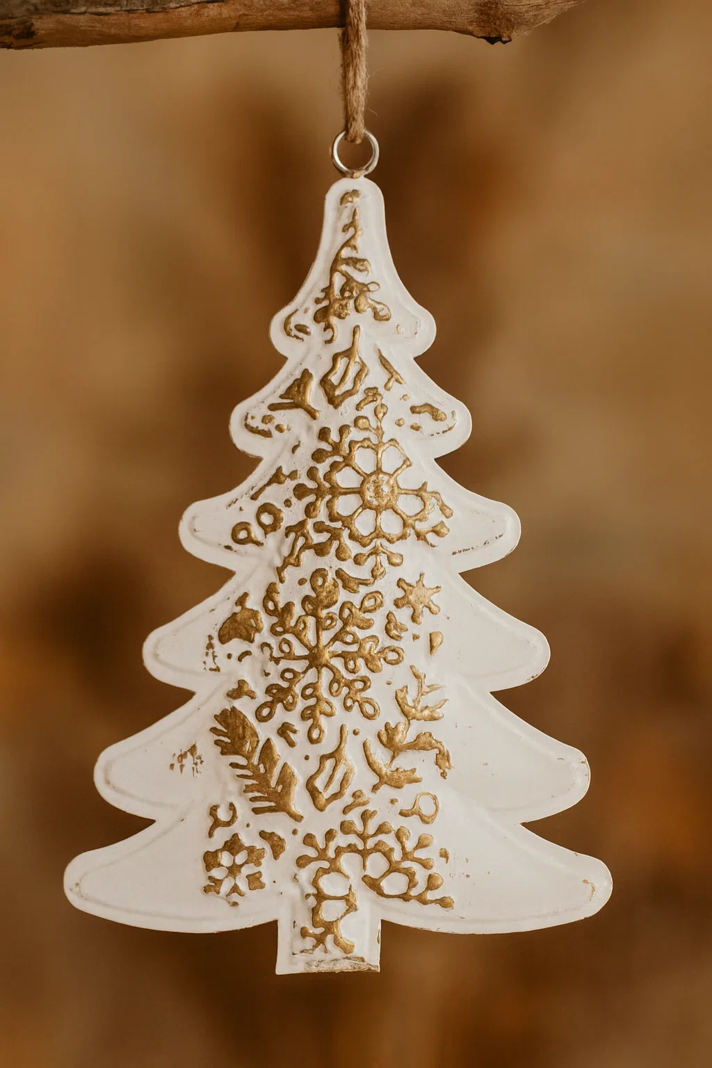 Árbol de navidad colgante de metal con detalles blancos y dorados en relieve ✨️