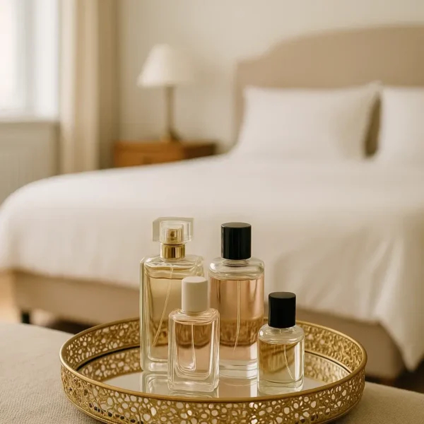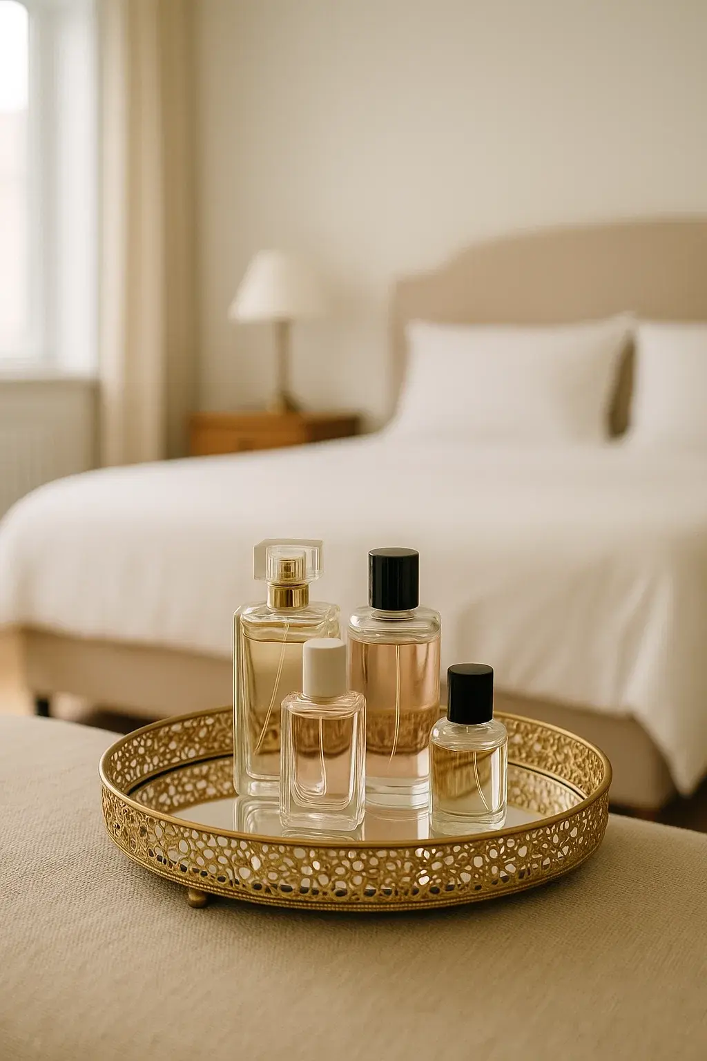 Su diseño elegante y versátil la convierte en el complemento ideal para colocar difusores, velas, perfumes o pequeños objetos decorativos, aportando brillo y estilo a mesas, cómodas o tocadores.