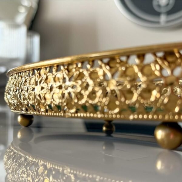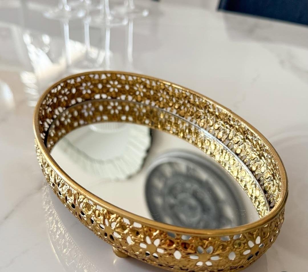 Un detalle de lujo para realzar tus espacios. Esta bandeja decorativa con base espejada y borde calado en dorado es perfecta para organizar y dar un toque sofisticado a cualquier rincón de tu hogar.
