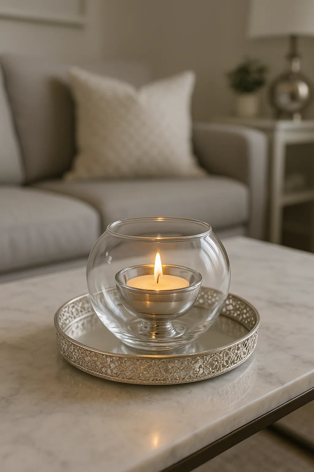 Su diseño elegante y versátil la convierte en el complemento ideal para colocar difusores, velas, perfumes o pequeños objetos decorativos, aportando brillo y estilo a mesas, cómodas o tocadores.