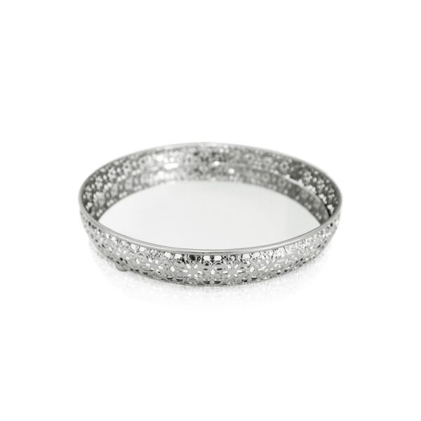 Un detalle de lujo para realzar tus espacios. Esta bandeja decorativa con base espejada y borde calado en plateado es perfecta para organizar y dar un toque sofisticado a cualquier rincón de tu hogar.