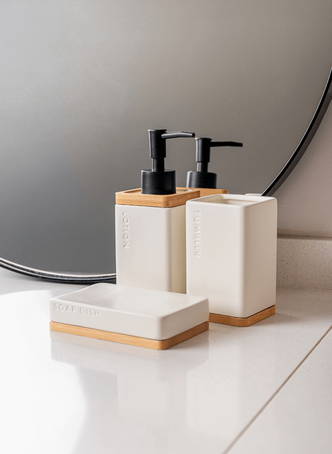 Set para baño: dispenser, portacepillo y jabonera.