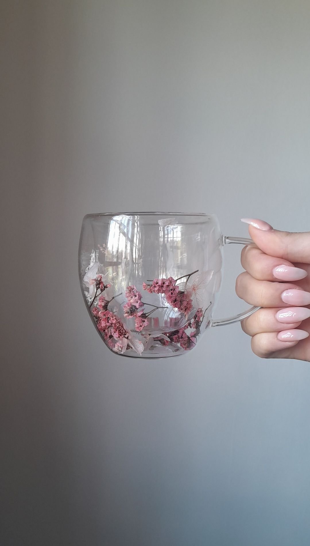 Taza doble vidrio con flores secas en su interior con capacidad de 250ml.