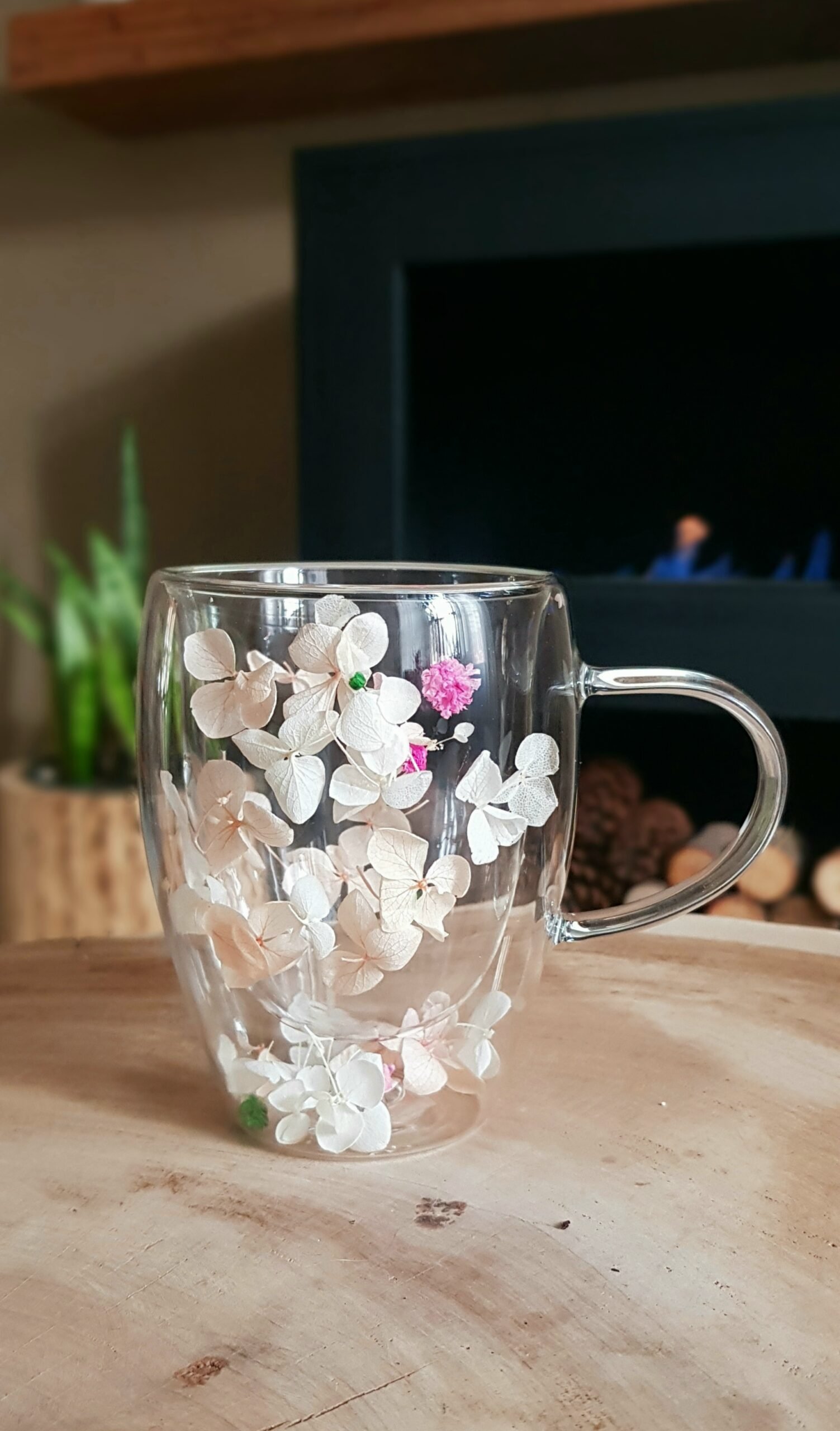 De doble vidrio con flores secas en su interior, tienen una capacidad de 350 ml.
