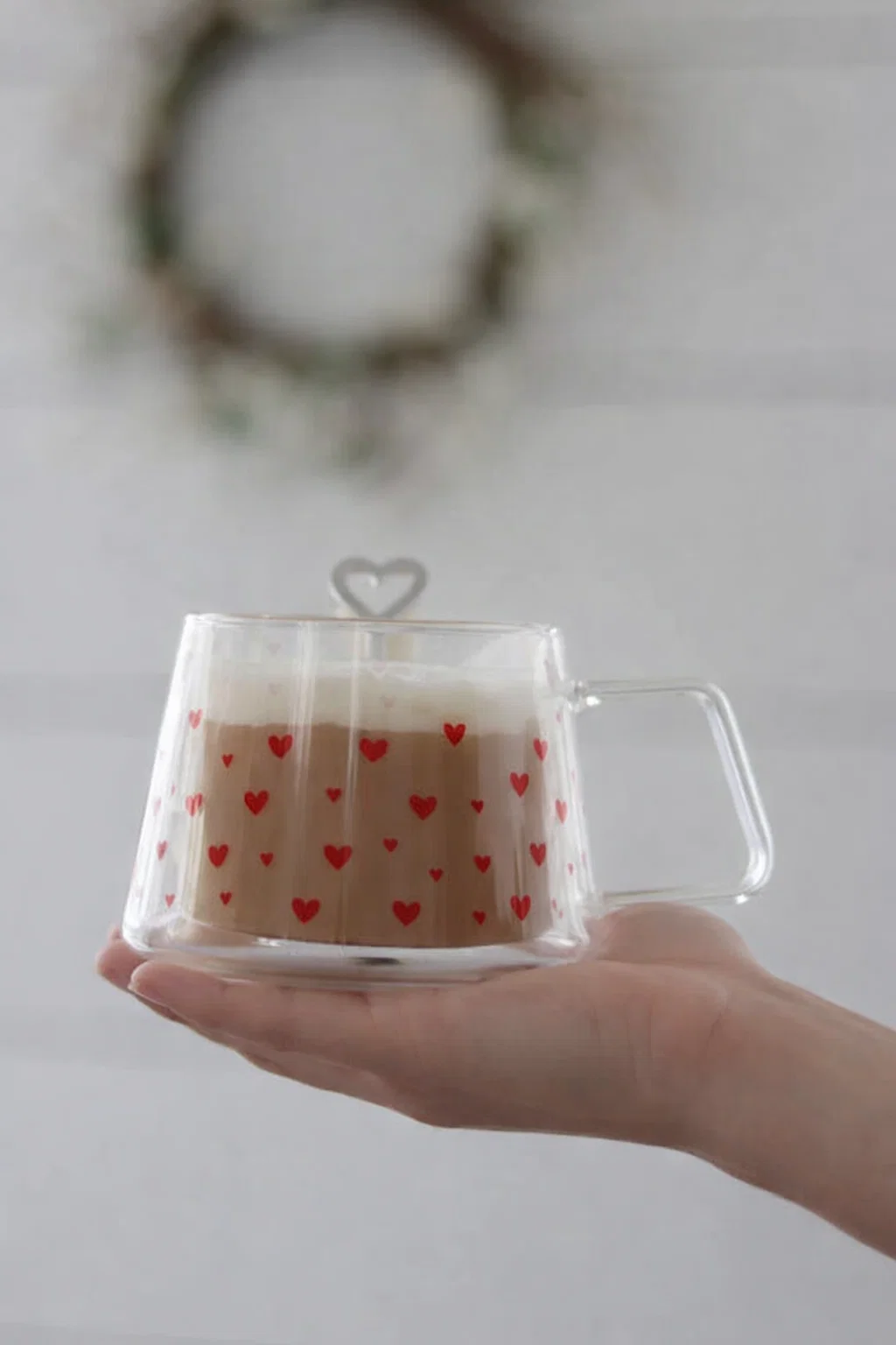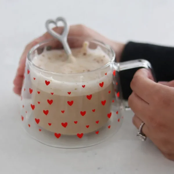 Taza de doble vidrio con estampado de corazones que combina diseño y funcionalidad. Ideal para regalar o disfrutar tus bebidas favoritas con un toque especial.