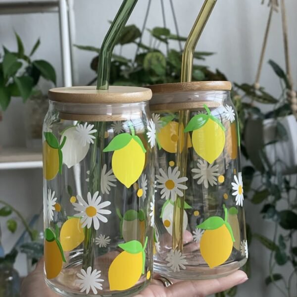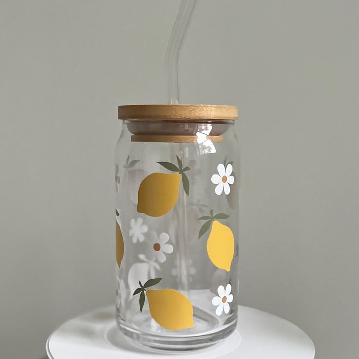 Vaso de vidrio con limones y margaritas de 480 ml, incluye tapa de bambú y sorbete de vidrio