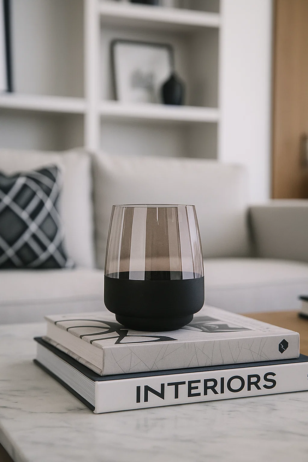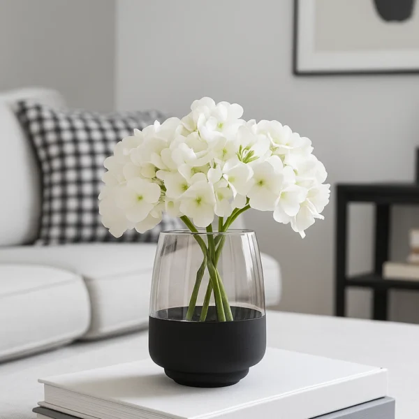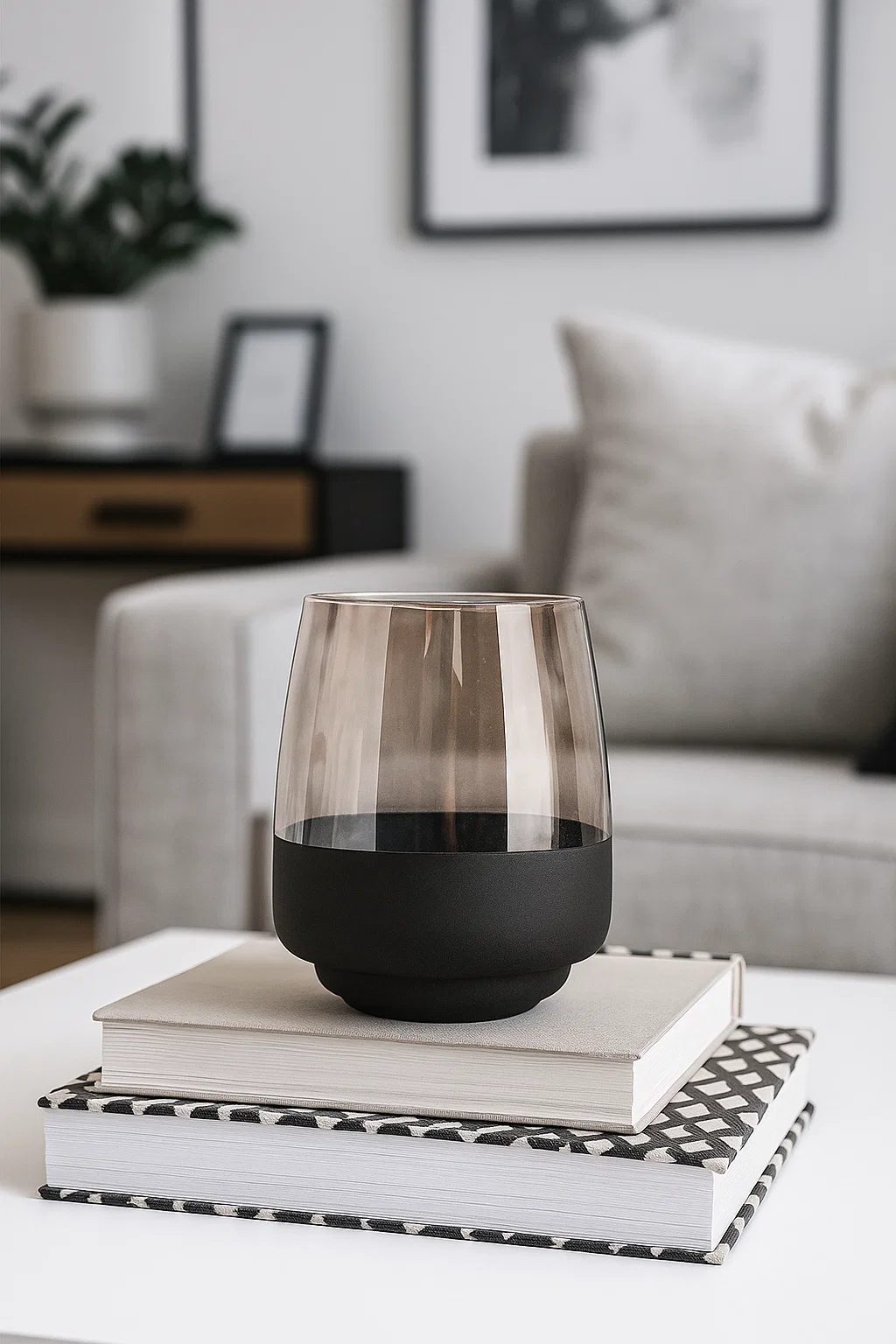 Un diseño moderno y minimalista que se adapta a cualquier estilo de decoración. Su vidrio ahumado con base negra mate le aporta un aire elegante y sofisticado, ideal para usar como florero o como portavela con nuestras velas en perlas, también disponibles en la web